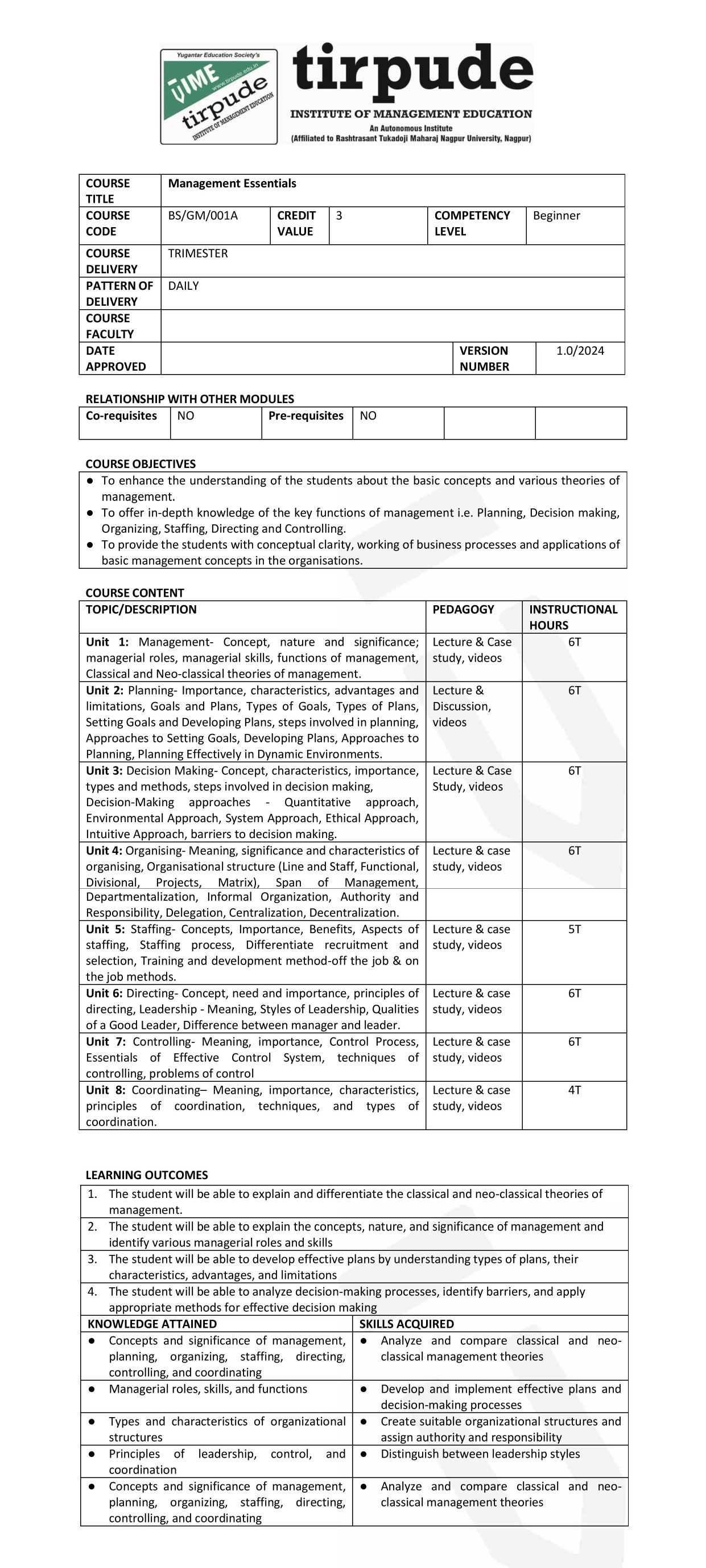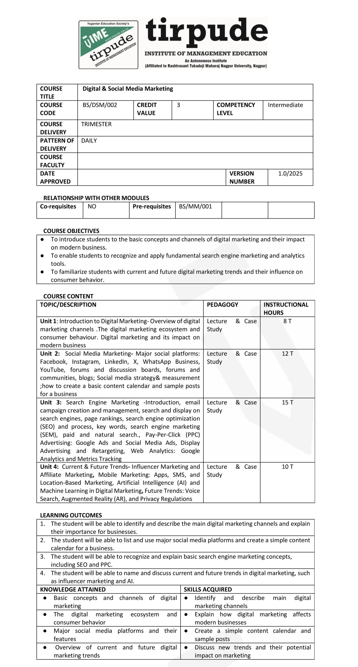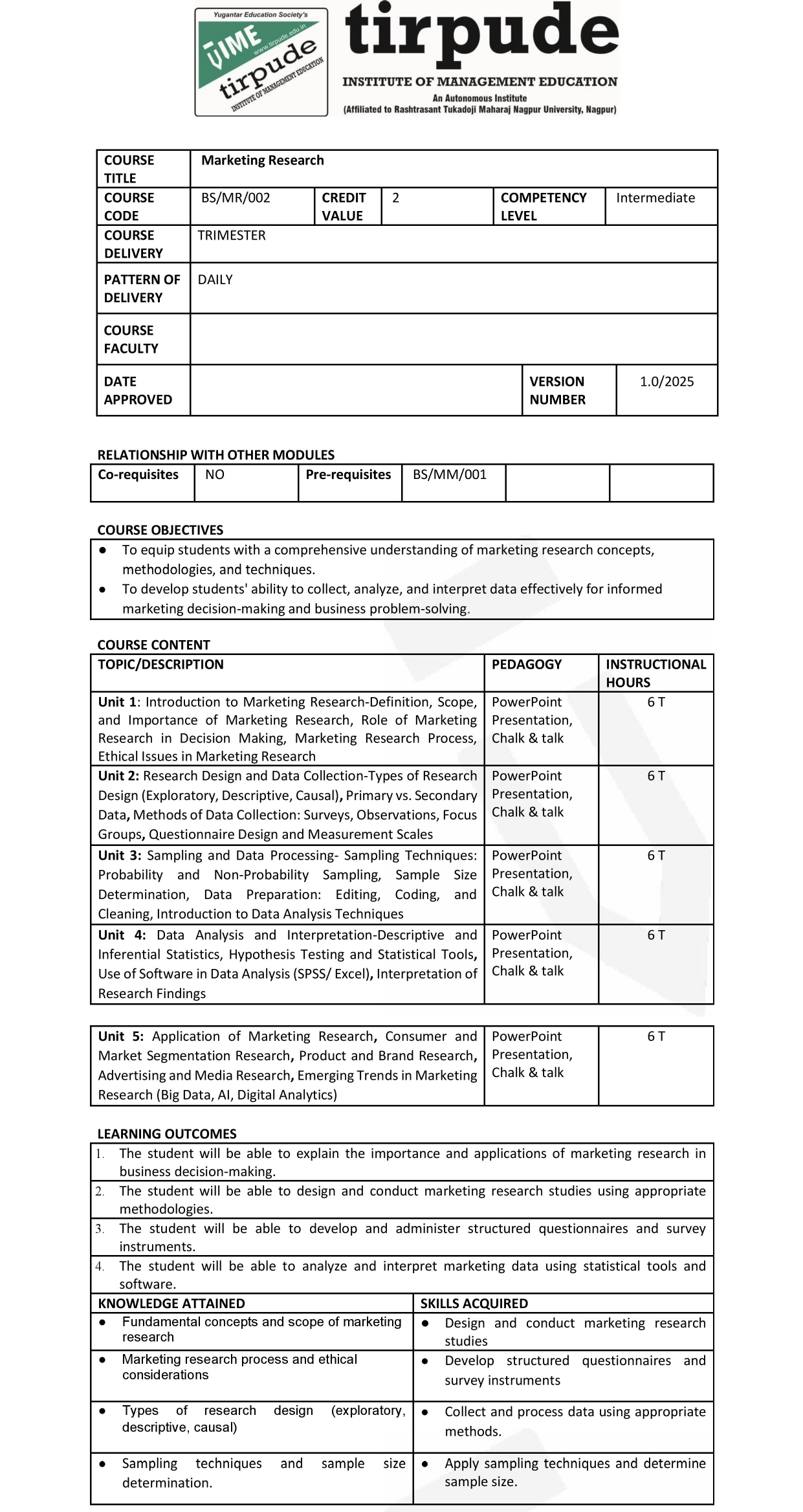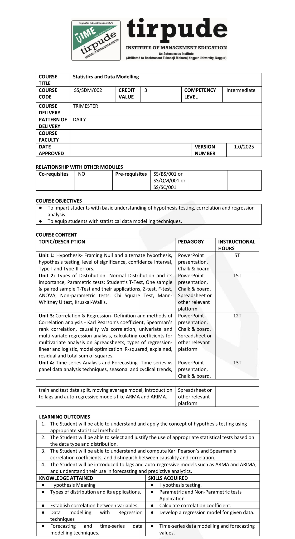 Tirpude Institute of Management Education is an autonomous institution approved by the All India Council for Technical Education (AICTE),New Delhi, recognized by Directorate of Technical Education, Government of Maharashtra, and affiliated to RTM Nagpur University. We adhere to the highest academic standards and continuously update our programs to meet industry demands.